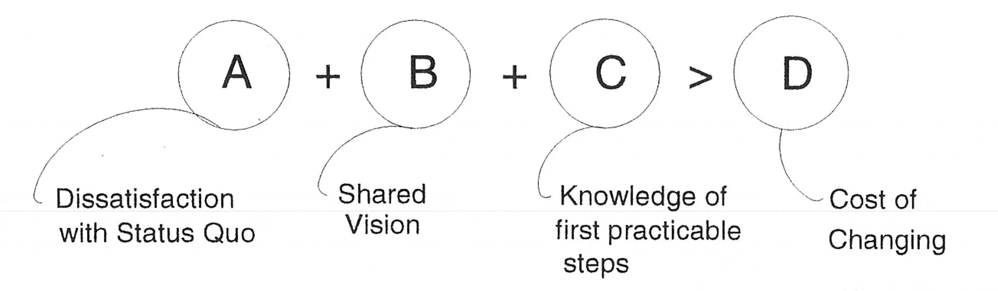 Create dissatisfaction with the old, vision for the new, and clarity on the path (A+B+C>D).