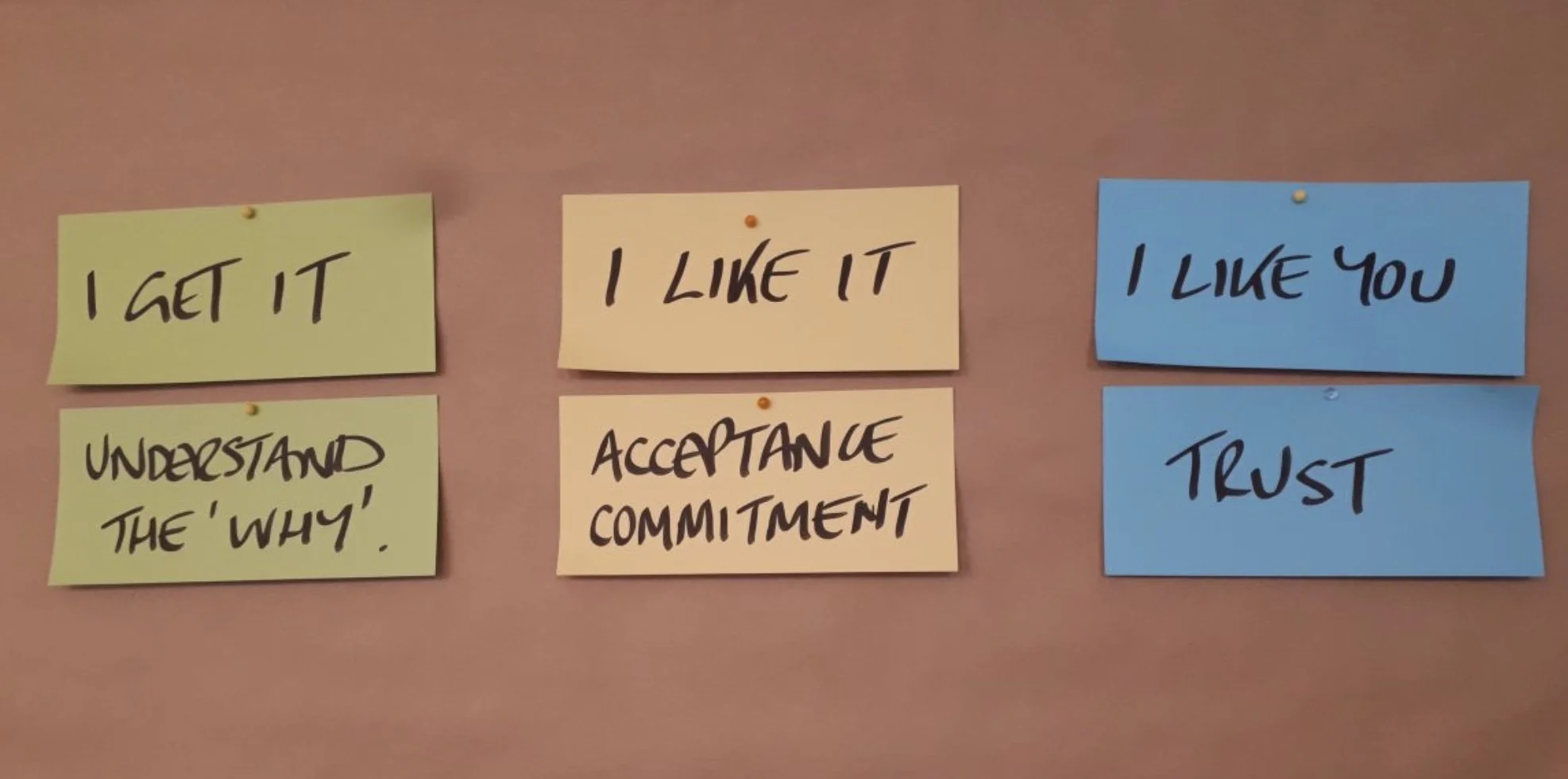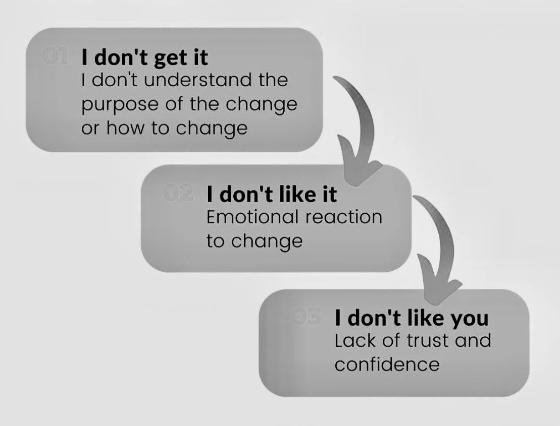 Nature of resistance: Relational/personal — distrust of the leader, organisation, or past experiences. Even if people understand and accept the idea, they resist who is leading it.