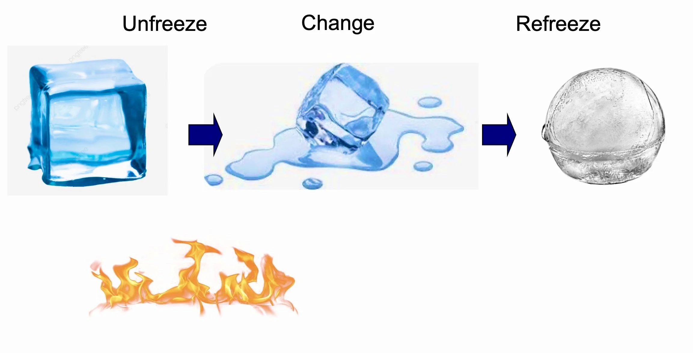 For change to occur, there must be an “unfreezing” or disruption to the current comfort zone. And the desired new state has to then be reshaped, held in place, and “refrozen”.